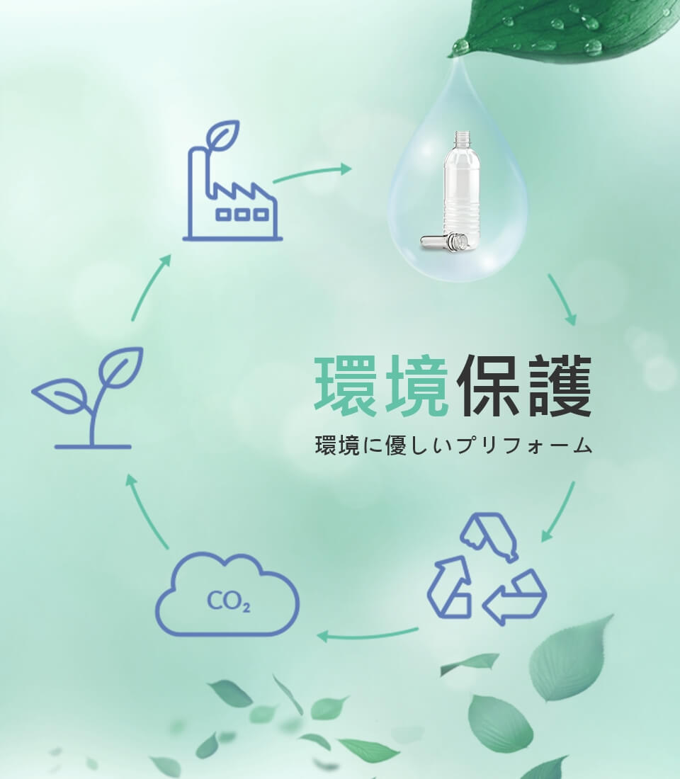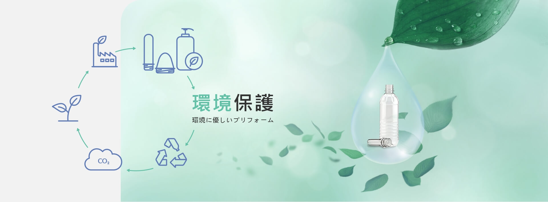 お客様の省エネルギーや環境保護のニーズにお応えすべく、2019年から環境に優しいPET容器を開発してまいりました。100%石油資源を原料とする容器に代わり、バイオPETやリサイクルPETなどで各種のプリフォームや容器を製造しております。例を挙げると、小型スプレーボトルや洗剤瓶などを海外のお客様にご提供しております。
